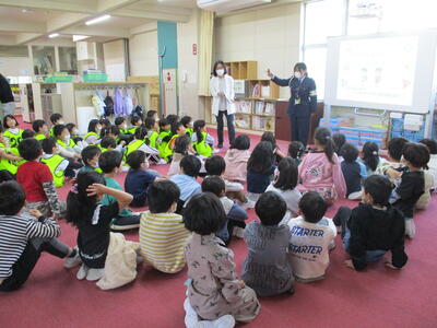 道路を渡るときには①とまる②みる③まつ、そして手をあげて渡ります!
