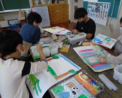 グループに分かれて、相談したりアドバイスし合いながらワイワイ制作しています。