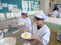 6年1組が調理実習でスクランブルエッグを作っていました。