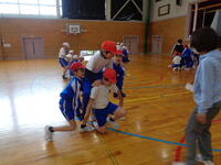 5年生は体育館で騎馬戦の練習。