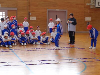陸上とサッカーしている男の子がみんなの前でお手本役です。