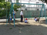 運ていやブランコ、鉄棒で遊ぶ低学年の子たちは