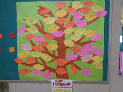 「読書の木」が色とりどりの葉っぱをつけました。