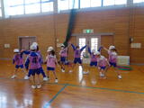 グループみんなで手をつないだ間を順番にくぐったり、跳んだりして通り抜けてます。