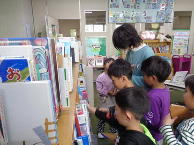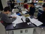 図書の大沼先生のガイダンスの後、いよいよ図書センターで貸し出しがスタート!