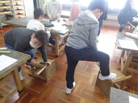 初めて手にしたノコギリに、みんな苦戦している様子。