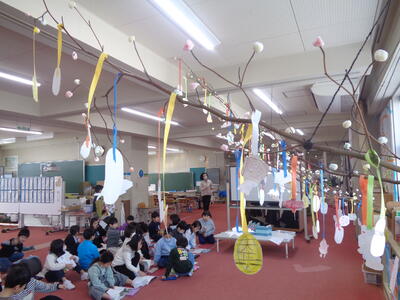 みんなで作っただんごや描いた縁起物をつけた「だんご木」が飾られ、