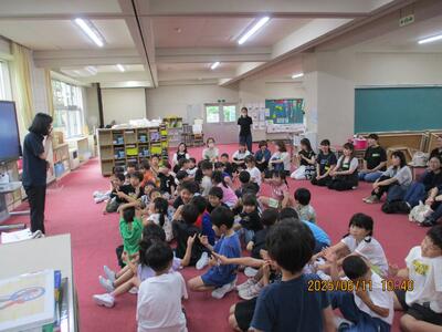 まずは学年ホールで西根小学校栄養教諭の高橋遥先生の