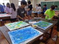 網を絵の具のついたブラシでこすって描く「スパッタリング」をしたり、