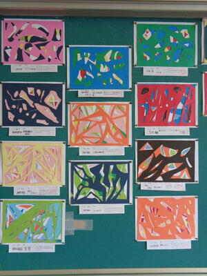 図工で作ったカラフルな作品が飾られています。