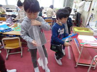 長細いビニールに絵を描いて、色画用紙を貼ったらロケットの完成。