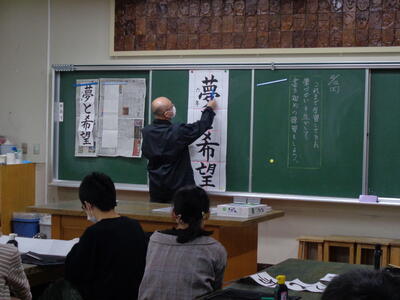 今日が最初なので、教頭先生から紙の折り方、それぞれの字の注意点や書き方のポイントを。