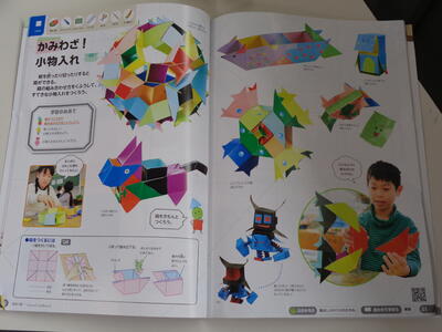 いろいろな大きさに切った紙を、切ったり、折ったり、組み合わせて貼ったり、