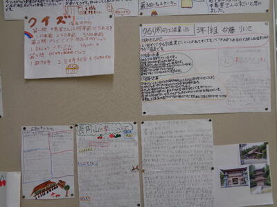 【3年生】寒河江市の自慢 投稿: 管理者 (12:37) 3年生が総合で学習した みんなの寒河江市自慢が集まりました! *寒河江小学校 *寒河江城址 *ご近所の中島菓子店 *焼鳥さらや *チェリーランド *クラッピンサガエ *ゆるり寒河江 *長岡山 などなど… 実際に調べに行ったり、インタビューしたり、ネットで調べたり、 がんばって情報を集めました。 書き方も工夫し、みんなの伝えたい思いがしっかり伝わってきますね。 Tweet -